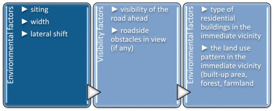 The field results presented in Table 2 and in Figure 9 were analysed to establish probable determinants that can, in combination, influence the speeds measured before the pedestrian refuges. These determinants, relating to the pedestrian refuges located in the entry zones and in village centre areas are presented in Figure 10a. Therefore, the determinants presented in Figure 10a should be taken into account when siting the pedestrian refuges in the entry zones and this, in combination with appropriate engineering and traffic planning, should result in obtaining approach speeds not exceeding the speed limit in residential areas. Figure 10b, in turn, presents the determinants in relation to the road sections before the pedestrian refuges located in the exit zones.