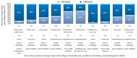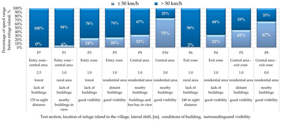 Taking this into account, the authors analysed also the percentages of vehicles travelling with speeds of ≤50 km/h and > 50 km/h and the results of this analysis are presented in Figure 9. Figure 9 gives also information if the test section is located before or after the pedestrian refuge, i.e., in the entry zone, village centre or exit zone. On the left side of Figure 9, there are test sections situated before the pedestrian refuges positioned in the entry zones and in the village centres and on the right side, there are four test sections located at the border of or within the exit zones. Two test sections—P1 and P7 were located at the border between the entry zone and village centre and, similarly, two sections—P2 and P8 were located at the border of the village centre area and the exit zone and, hence, different designations have been used for them depending on the direction of traffic, before and after the pedestrian refuges in question. The analysis of percentage data showed that only on two test sections, namely P8 and P10 the percentages of speeds below 50 km/h limit before the island locations were ca. 67% or 75%. The approach speeds obtained in the other cases were much higher. With the purpose to establish which determinants could have a predominant effect on the speed measured before the pedestrian refuge or on the percentage of speeds ≤50 km/h Figure 9 presents the relevant characteristics of each pedestrian refuge including its sitting along the road stretch, the surrounding environment, residential buildings and view of the road ahead. For identification of determinants, the test sections in Figure 9 have been put in order of increasing percentage of speeds smaller or equal to 50 km/h in both parts of the chart.