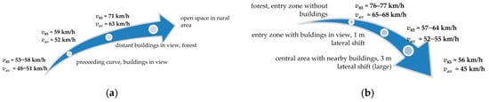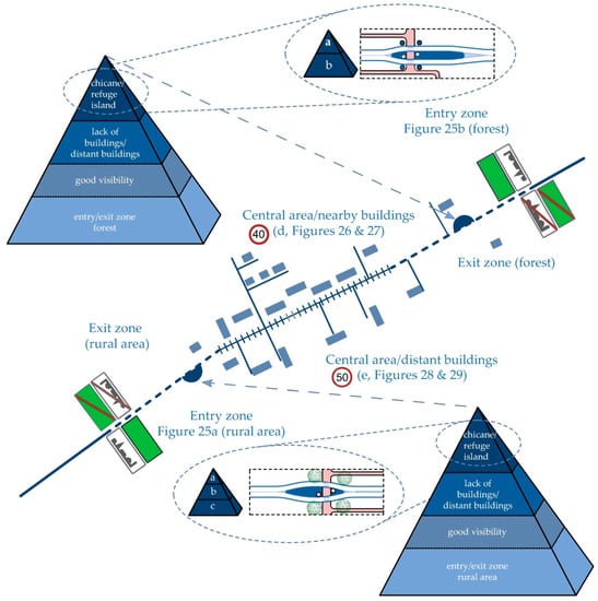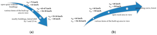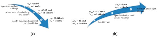 Speed reducing effect was confirmed on the three other test sections—P1, P7 and P9, with residential buildings in close proximity and different sight distances. The greatest speed reduction was recorded in the case of asymmetric lateral shift in the travelway alignment by 2.5 m, yet this should be attributed to the bridge in view and houses in close proximity of the road rather than to the lateral shift and the pedestrian refuge on one side of the road centreline. The probable determinants of speed variation alongside the pedestrian refuges located in the entry zones or village centres and in the exit zones are presented in Figure 17a and Figure 17b respectively. Similar cases, with the speeds after the pedestrian refuges greater than before were noted on the sections in exit zones (test sections P2, P3 and P8) with good visibility of the road ahead and where the exit section was surrounded by forest rural area or built-up area, yet with buildings located far away from the road. Significant reduction of vehicular speeds was noted only when the motorists approached the fragment of the road giving shorter sight distance (P6).
