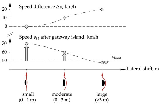 Relationship between the speed parameters ∆v85 and v85 after the gateway island and the lateral shift (redrawn from Wirksamkeit geschwindigkeitsdämpfender Maßnahmen außerorts, 1997 [14], p. 9).