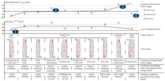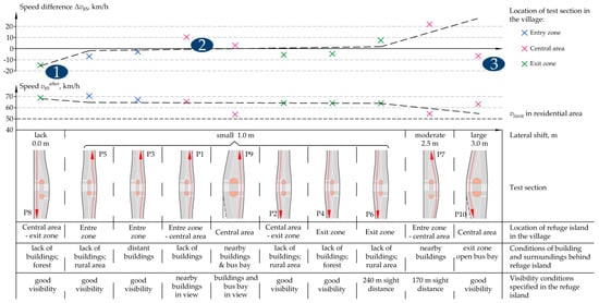 Unfortunately, appearance of residential buildings in close proximity does not, on its own, have a determining effect on motorists driving at speeds much exceeding the limit of 50 km/h. The authors believe that there are a number of factors relevant to the degree of speed reduction, including, without limitation, the lateral shift, refuge shape (symmetric or adjacent to the road centreline), distance to the nearest residential buildings, visibility conditions before and after the refuge, rather than the lateral shift being one and only factor, as it could be concluded from the research results presented in Figure 11.