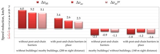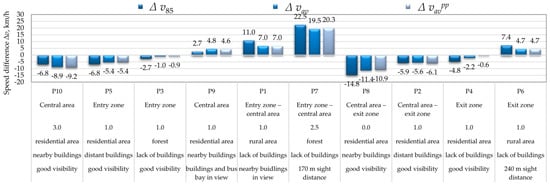 The second parameter defining the speed reducing performance of the pedestrian refuges for the approach and departure speeds is the speed reduction alongside the pedestrian refuge. The obtained speed differences are presented in Figure 16, together with a description of developments in the vicinity of the pedestrian refuge and view of the road ahead. From the data presented in Figure 16 it transpires that the main determinants of obtaining the desired speed reduction are the surrounding environment of the pedestrian refuge and view of the road ahead, i.e., accurately communicated information in the driver’s field of view. The issue of the driver’s perception of the information present in the visual field is studied in [11,12] and the issue of perception of the information given on the new generation traffic signs is covered in [10].