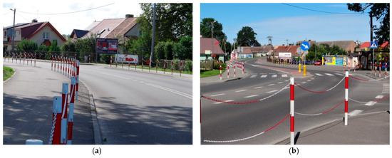 Based on the results of this research, the authors recommend symmetric pedestrian refuge islands, 2 m or 2.5 m wide, the latter to accommodate bicycles, if required, as an appropriate design for the village centre areas. In order to highlight the pedestrian refuge location and influence the driver’s perception, it should be accompanied with post-and-chain barriers [5,7] or barrier bollards of various colours and sizes, the latter being a popular measure used in the West European countries. Examples of designs used in Poland are presented in Figure 18 and Figure 23. Figure 26, in turn, shows the proposed design including post-and-chain barriers. According to [5] the post-and-chain barriers should extend ca. 10–15 m upstream of the pedestrian refuge, measuring from the end of the hatched marking and at least to the end of the hatched marking at the other end.