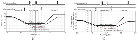 Free-flow speed profiles before and after upgrading of the regional road section in the village area (drawings by D. Kacprzak and A. Sołowczuk [15]): (a) v85 speed profile; (b) vav speed profile.