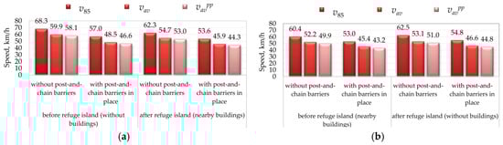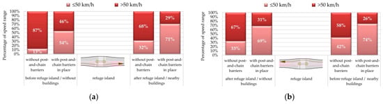 The analysis of the data resented in Figure 21 showed that retrofitting of the post-and-chain barriers influenced the drivers’ behaviour making them slow down to below the speed limit in residential areas (50 km/h) on the road section concerned. The surrounding environment of the approach section to the pedestrian refuge was found to be also relevant in this case. In the case of approach section surrounded by a forest and post-and-chain barrier limited to a short section preceding the pedestrian refuge, the percentage of speeds ≤50 km/h was smaller before (54%) than after the pedestrian refuge (71%) where the drivers could see the road section lined with post-and-chain barriers over the length of 200 m (Figure 20a and Figure 21a).