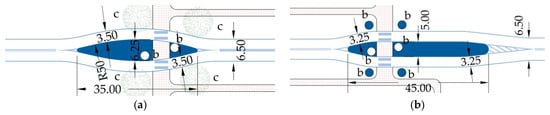 The flow chart for selecting the type and width of the pedestrian refuges on regional roads in villages, based on chosen factors, is presented in Figure 24. The authors recommend, following the German guidelines [13], to consider in the entry zones the environmental factors and use symmetrical central islands combined with pedestrian crossings. In open rural areas, ca. 35 long by 6.25 m wide, symmetric lens-shaped central islands should be used, imposing a large lateral shift in the travelway alignment, passed on a curve with 50 m radius, with min. 3.5 travel lane width, enhanced with barrier bollards and single tree plantings at the pedestrian crossing location (Figure 25a). In forest areas cigar-shaped central islands are recommended, ca. 45 long by 5 m wide, passed on min. 3.5 m wide travel lanes, enhanced with barrier bollards only (Figure 25b). Additional plantings are not required where the surrounding environment is occupied by a forest. According to the Swedish [8] and German [13] guidelines and taking into account the drivers’ perception studies reported in [10,11,12] the authors indicate a need of interactive road signs to be placed in the entry zones to warn the drivers of the central island and pedestrian crossing located ahead of them (activated by motion sensors).