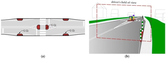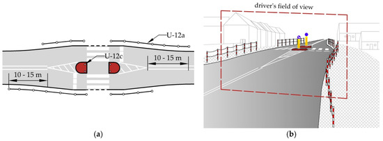 The basic engineering requirements to be applied for pedestrian refuges located in Poland are given in [1,5]. The key points concern maintaining the width of the travel lane alongside the pedestrian refuge, as given in the Design Guidelines [6] depending on the level of service of the road and use of symmetric 1:5 to 1:10 tapered hatched markings as the approach end treatments. However, the guidelines [7] are not specific if the lines of P-7b pavement marking should be extended up to the island nose or to the meeting point with the P10 or P11 line marking, (for the meaning and pictures of signs referred to by their acronyms see the table in the Appendix A). However, they give a recommendation the travel lane width should be measured between the centres of the marking lines or between the line centre and face of the curb. Furthermore, guidelines [5] recommend using different taper geometries depending on the pedestrian island position (in the entry zone, central area or in the vicinity of public buildings respectively), with more aggressive design for the village central areas and less aggressive for the entry zones.