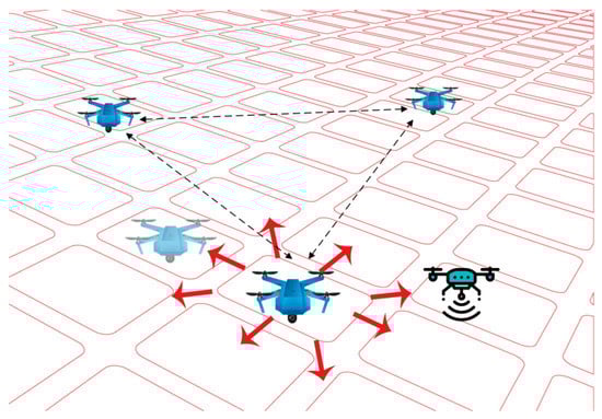 Schematic diagram of the relocation of a UAV. The black dotted line in the figure represents the wireless channel between the UAVs, and the red grid represents the grid world of UAVS, and the red arrows represent the directions in which the UAV may move after the jammer adjusts the jamming strategy.