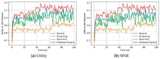 In the first experiment, we compared the performance of the above four reinforcement learning algorithms under a certain jamming strategy randomly selected by jammers in 100 time slots. In this performance analysis, two most important metrics are selected, which are the utility and the SINR of the UAV network. The utility metric can be calculated by Equation (2), and the SINR metric is just the first item on the right side of Equation (2). As shown in Figure 5, the utility and SINR of the UAV network increases over time and gradually converge with different amplitudes. The improved Dyna-Q based strategy has the highest utility, followed by the Dyna-Q, WoLF-PHC, and Q-learning-based strategies. After 100 time slots, the utility of the improved Dyna-Q-based strategy is 1.1252, which is 6.9%, 13.8%, and 18.6% higher than that of the Dyna-Q, WoLF-PHC, and Q-learning-based strategies, respectively. The performance of the WoLF-PHC algorithm has large fluctuations. After 40 time slots, the range of utility of the WoLF-PHC-based strategy varies from 0.88 to 1.11, which is wider than that of the other three strategies. Besides, the SINR values calculated by the four algorithms have a similar trend compared to their utilities. The utility values are calculated by subtracting each cost from the SINR values. However, although three costs (path planning, data transmission, and frequency hopping) vary randomly, the sum of the three will offset a large part of the change, resulting in a stable trend of the sum of the three, which causes the trend of SINR to be very similar to that of utility. By the end of the simulation, the SINR with improved Dyna-Q is 3.1141, which is 2.8% higher than that of Dyna-Q, 5.4% higher than that of WoLF-PHC, and 6.6% higher than that of the Q-learning strategy.