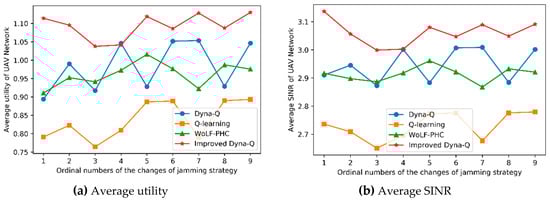To better observe the impact of changes in the jamming strategy, we averaged the utility and SINR within the same jamming strategy. The results are shown in Figure 7, Table 3, and Table 4. The average performance of the UAV network with the improved Dyna-Q strategy is optimal, the average performance of Dyna-Q and WoLF-PHC are lower and similar, and the average performance of the Q-learning algorithm is the worst. For instance, the mean value of nine average utilities in Table 3 with improved Dyna-Q is 1.0968, 0.9861 with Dyna, 0.9618 with WoLF-PHC, and 0.8380 with Q-learning. The performance advantage of the improved Dyna-Q algorithm is obvious, which is closely related to the situation awareness capabilities of the SDN architecture. The reason for the low performance of the Q-learning algorithm is that the fast-paced attack and defense strategy changes make the algorithm unable to converge in time. It is well known that the Q-learning algorithm can only update the Q value of one state per episode if the delay update mechanism is not used. This slow learning will inevitably lead to slow convergence. For example, in the 60–80th time slots of Figure 6a, the utility of the Q-learning algorithm shows a continuous but slow growth. The phenomenon of nonconvergence after 20 time slots is not uncommon in the other three algorithms. The advantage of the Dyna-Q algorithm over Q-learning is that it can be learned from models built with historical experience to speed up convergence. The advantage of the improved Dyna-Q algorithm over the Dyna-Q algorithm is that it can be learned from the SINR model fitted by Equation (7) to speed up convergence. The advantage of WoLF-PHC is that it can dynamically adjust the learning rate parameters according to the learning effect to speed up the convergence. Due to the smart jamming attack, Dyna-Q has almost no advantage over WoLF-PHC. The reason is that the changed attack strategy invalidates many experiences in the Dyna model. Learning the wrong experience in the Dyna model leads to the learning effect not rising, but falling.