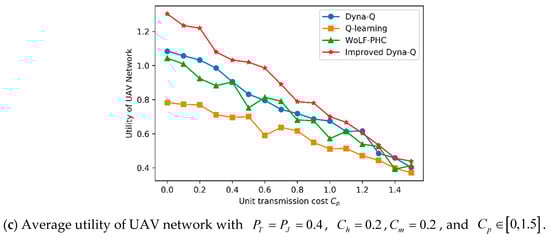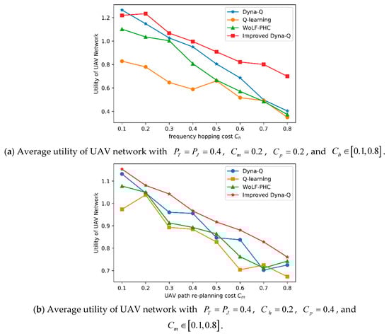 The last experiment was used to test the effect of changes in key parameters on UAV network performance with , , , and . The key parameters we chose are three costs, which are frequency hopping cost, ; UAV path replanning cost, ; and unit transmission cost, . The simulation results are shown in Figure 8 and Table 5, Table 6 and Table 7. The same effect of the three cost parameters on network performance is that the utility decreases almost linearly as the cost increases. For instance, the utility of the UAV network decreases 68.0% with Dyna-Q if the frequency hopping cost changes from 0.1 to 0.8. The utility of the UAV network decreases 34.1% w improved Dyna-Q if the UAV path re-planning cost changes from 0.1 to 0.8. The utility of UAV network decreases 60.4% with WoLF-PHC if the unit transmission cost changes from 0.1 to 1.5.