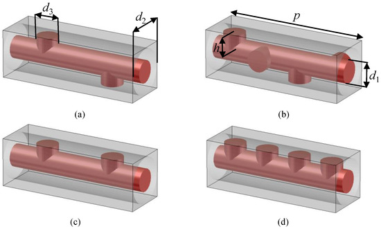 Pin-loaded coaxial transmission lines: (a) 2-fold twist-symmetric, (b) 4-fold twist-symmetric, (c) non-twist symmetric with 2 pins, and (d) non-twist symmetric with 4 pins. ( mm, mm, mm, and mm).