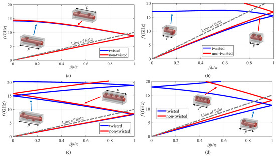 A dispersion diagram comparison of the twist-symmetric and their non-twist symmetric structures shown in Figure 1: (a) with 2 pins ( mm), (b) with 2 pins ( mm), (c) with 4 pins ( mm), and (d) with 4 pins ( mm).