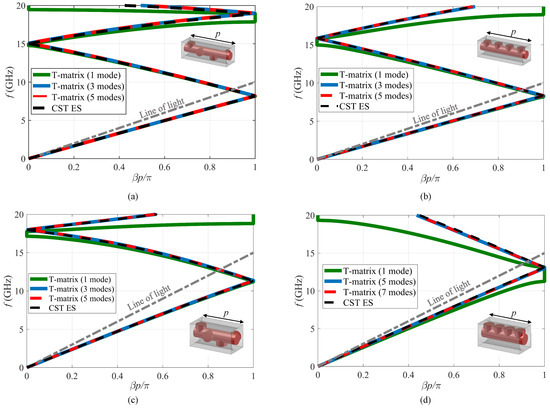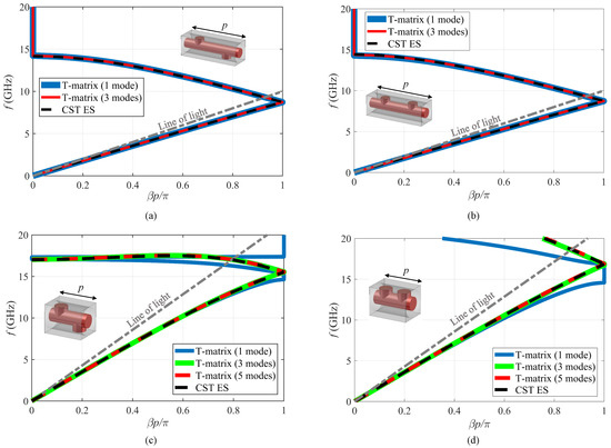 Figure 3c depicts the dispersion diagram of the irreducible ( mm) 2-fold twisted unit cell studied in Figure 2b together with the dispersion diagram calculated with the CST ES. Here, a monomodal T-matrix method leads to the correct dispersion curve in the lower range of frequency. At higher frequencies, at least 3 modes are required. The results for 5 modes ( and ) are also sketched in the figure to further emphasize the convergence. Figure 3d shows the same results for the associated non-twisted line. In this case, one mode only is not enough even at low frequencies. This confirms that the irreducibility of a twisted line is related to the presence of coupling through higher-order modes either in the twisted line or in its associated non-twisted line. These higher-order modes interact with each other differently in the presence or absence of twists and lead to different dispersive behaviors.