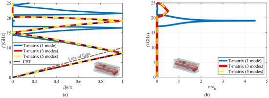 Figure 3a depicts the dispersion curves obtained with Equation (5) for the 2-fold reducible twisted cell studied in Figure 2a. It also plots the dispersion diagram obtained with a CST ES for comparison. We observe that, in this case, a monomodal T matrix (1 mode) is already enough to match the results obtained by CST ES. The results for a T matrix with 3 modes ( and in Equation (3)) also matches the monomodal T matrix and the CST ES results. This demonstrates that adding an extra set of modes does not vary the already converged results. Figure 3b shows the same results for the associated non-twisted line. Also, in this case, one single mode is sufficient to reach convergence. This confirms that in a reducible case a single mode is sufficient to accurately calculate the dispersion diagram of both the twisted and non-twisted lines.