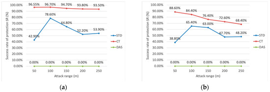 The impact of the attack range on the success rate of privacy protection: (a) fixed attacker position; (b) random attacker location.