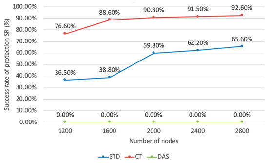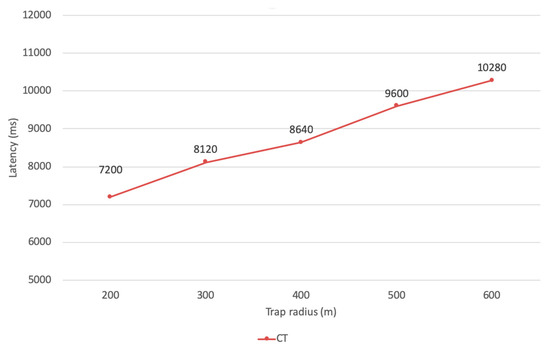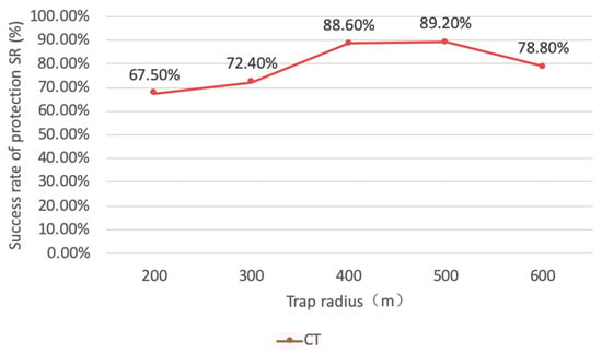 Table 2 and Figure 4 shows the performance of STD, DAS, and CT under different attack ranges. As can be seen from the experimental results, in most cases, both STD algorithm and CT algorithm interfere with the listening and tracking behavior of attackers, while the normal DAS scheduler has no impact on them. The STD algorithm is vulnerable to the impact of the size of the attacker’s attack range, which makes the privacy protection effect of the algorithm fluctuate. In contrast, the privacy protection effect of the CT algorithm is relatively stable, and the success rate of protection is increased by 20%~50% compared with the STD algorithm. Figure 5 shows the performance of STD, DAS, and CT under different number of nodes. As the number of nodes increases, the number of hops the attacker can trace back to find the source node increases, so we can see from the figure that the success rate of protection increases as the number of nodes increases. Figure 6 shows the performance of CT under a different trap radius. From the figure we can see that when the trap radius is less than 500 m, the attacker is more likely to detect the node on the trap, and the protection success rate increases as the trap radius increases. However, when the trap radius is larger than 500 m, the probability that the attacker and the source node fall into the trap at the same time increases, which causes the trap to be ineffective, and the protection success rate is reduced.