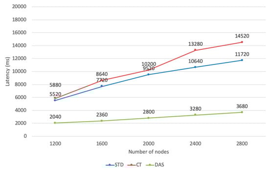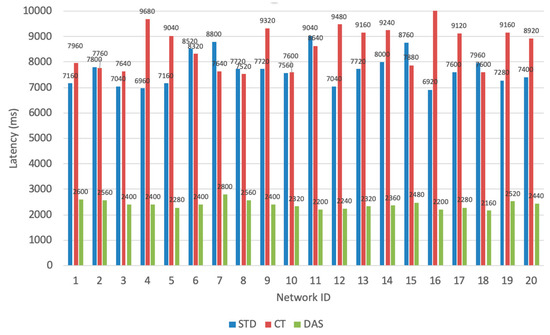 Figure 7 shows the latency of STD, DAS, and CT under 20 different networks. We can know from the experimental results that DAS algorithm has the minimum latency. The CT and STD algorithms adjust the slot values of some nodes to construct trap, so the TDMA slot value of the network increases. In order to improve the security of the algorithm, a slight network latency is allowed within our acceptable range. Figure 8 shows the latency of STD, DAS and CT under different number of nodes. The maximum value of TDMA slot increases as the number of nodes increases, so we can see from the figure that the latency increases as the number of nodes increases. Figure 9 shows that the latency increases as the radius of the trap increases.
