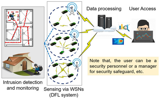In recent years, wireless technologies have attracted tremendous attentions in the field of security safeguard [1,2]. Device-free localization (DFL) [3], using wireless sensor networks (WSNs) to locate targets without carrying any attached devices or tags, has been an emerging technique for some emerging scenarios, e.g., intrusion detection and monitoring [4,5]. This looks impossible but has been shown realizable. As shown in Figure 1, the fundamental blocks of Internet-of-Things (IoT) networks with DFL system are presented in detail. WSNs are utilized to sense data on the target’s location-information in the DFL system and then the sensed data are sent to the edge server for processing. After data processing, the location-information can be mined for user access. As in the description of Figure 1, the user can be a doctor or a guardian for aging healthcare, security personnel or a house host for security safeguards, a manager for the location services of a shopping center, etc. Thus, the DFL model can be applied to the IoT-based applications as described at the beginning of Section 1.