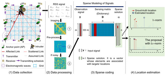Among these various classification methods, the sparse coding algorithm [9] is exploited based on the theory of sparse representation. Then, it is famous in the DFL field for several distinctive advantages, including high accuracy, high efficiency, simple operation and its ability to locate multi-targets etc. According to our previous work [10], the sparse coding algorithm with norm can achieve better localization performance than several classification methods, e.g., deep auto-encoder, KNN, etc. More specifically, the localization problem can be transformed into a typical sparse-representation-classification (SRC) problem, which can be effectively solved by sparse coding [10]. In step (3) of Figure 2, the overall framework and the basic principle of sparse coding is illustrated. It can be seen that, when an observation signal inputs the sparse model, through sparse coding, the sparse solution is obtained. Since the elements of sparse solution associated with the target’s location are outstandingly nonzero, then in step (4), the target’s locations can be estimated.