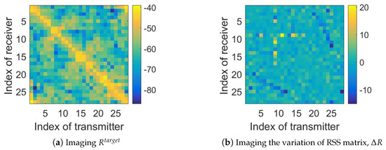 Here, we present an example of processing an outdoor data [23,28] sample, and the process is illustrated in Figure 5. As shown in this figure, since the original RSS signal, with absolute value from 40 dBm to 90 dBm, is measured directly from the environment, it may include many useless signal components which are stronger than the useful signal variation (of which the absolute value is from 0 dBm to 20 dBm). For example, the base signal of the background will not change, no matter if there are targets in the monitoring area. Therefore, a pre-process of background elimination is necessary for DFL data. In the indoor experiments, we perform the data pre-process by subtracting the from . Then, after this pre-process, most of the useless signal components can be eliminated and the signal variation will be distinguished.