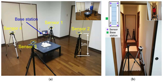 Scenarios and experimental setups of indoor DFL system. (a) Scenario of living room; (b) Scenario of corridor.