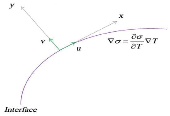 The Marangoni conditions at the interface are revealed in Equation (4), taking the surface tension where stands for the surface tension temperature coefficient and represents the surface tension constant at the origin.