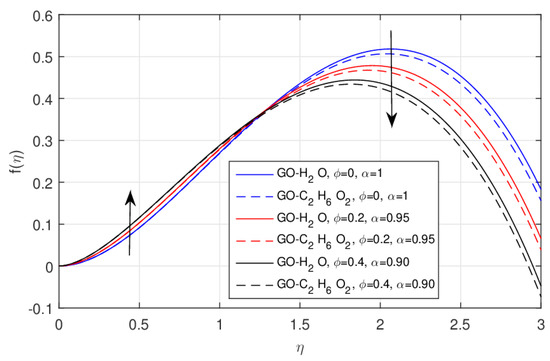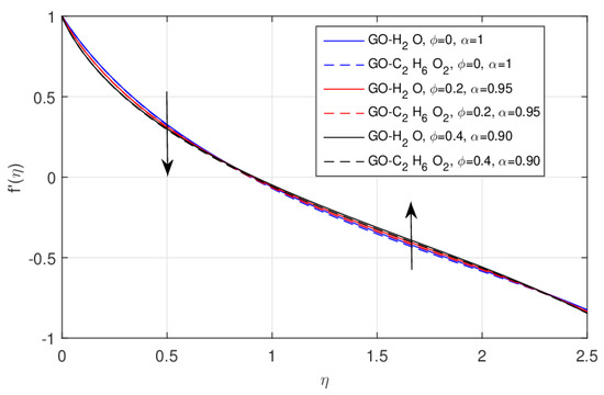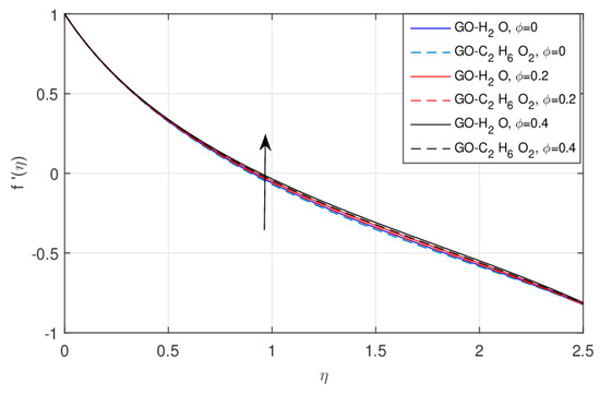The effect of the nanofluid volume fraction using the classical model versus the velocity profile for the GO-W and GO-EG nanofluids is depicted in Figure 2. The rising values of lead to enhance the velocity field linearly in the classical model. Physically, the larger amount of nanoparticle volume fraction generates the friction force, and this force is more visible near the wall, reducing the flow motion. However, this impact is unclear in the classical model. The increase in the flow motion due to the rising values of indicates that the thermal efficiency of the nanofluid provides strength to the flow field. Moreover, this impact is comparatively high using the GO-EG nanofluids.