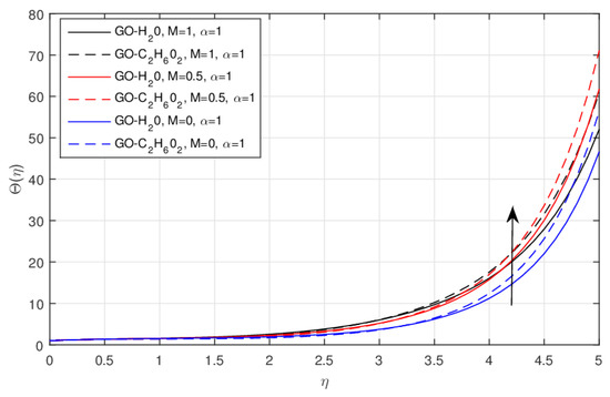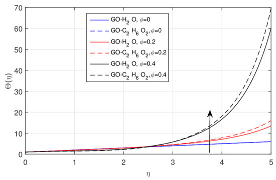 - Due to the rising values of , the thermal boundary layer increases and this effect is somewhat better in the GO-EG nanofluid rather than the GO-W nanofluid.