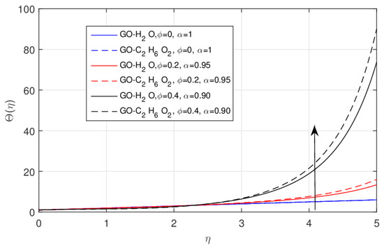 The impact of using the classical model and the fractional order model versus the temperature profile for the GO-W and GO-EG nanofluids is depicted in Figure 8 and Figure 9. The nanoparticle volume fraction is basically used as the heat transport agent parameter and its increase boosts up the temperature profile. In fact, the cohesive forces among the liquid molecules release with the increasing amount of and as a result the thermal boundary layer enhancement. This effect is comparatively efficient in GO-EG nanofluids due to their enriching thermophysical properties.