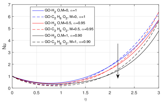 The impact of the fractional order versus for both sorts of nanofluids is depicted in Figure 12. It was observed that the heat transfer and cooling efficiency of the GO-EG nanofluid is comparatively higher than the GO-W nanofluid. The Nusselt number increases near the wall surface and declines towards the free surface.
