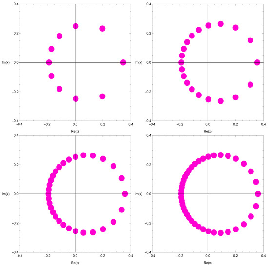 The ∗ mark in inside of Table 1 means that there is no solution of . It is possible to visualize the zeros of using computer graphics. The zeros of , where are visualized in Figure 1.