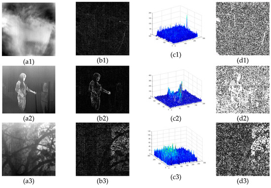 To clearly show the four direction gradients of each pixel , Figure 2b1–b3,c1–c3 give the gradient images for three different infrared images and their corresponding 3D gradient maps. It can be seen that the gradient values are larger at the edges than other regions from Figure 2b1–b3. Especially for the targets regions, the gradient values are the highest in the gradient map. Meanwhile, the gradient values of the stable background are very small. By contrast, the gradient values of the regions containing nonuniformity are higher than that of stable background regions but lower than that of the edge regions, as shown in Figure 2b1–b3,c1–c3.