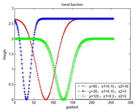 where and are parameters that adjust the maximum value of the weight and the width of valley-shaped curve, respectively, is the mean value of the gradient image, which set the position of the minimum of the curve, is a function that measure the distance from to the median gray level value , which regulate the in Formula (9). is the regularization factor. Figure 3 presents the kernel function with different parameters. The efficiency of can be seen clearly from blue and green curves in Figure 3. The further is from , the larger the value of , so that the smaller is, the narrower the width of the valley-shaped curve is. In this way, when the average gray value of gradient image is small, the area of smaller the gradient image will be protected from over-smoothed. So that the suppression ranges are adjusted adaptively according to . Thus we can alter the smoothed area and smooth degree by setting the parameters. Figure 2d1–d3 are the gradient images that have been processed by the kernel function, namely, the global weight maps. In the weight maps, bright areas represent greater weight.