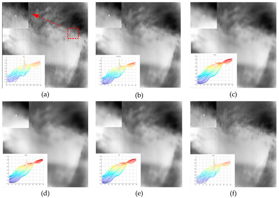 To clearly show the performance of WGIF with different global weight maps, GGIF, and GIF, we select an infrared video with a small target in sky background. To show the results clearly, the region of 48 × 48 around the small target is zoomed and displayed in the upper left corner of the image. At the same time, this region is also displayed by 3D image and displayed in the bottom left corner of the image. Figure 4 gives the results obtained by these filters. From Figure 4, GIF, WGIF with Sobel operator and the weight map proposed in the literature [26] perform excellently in stripe noise removing, but the scene details are somewhat blurred, especially, the intensity of the target is weakened. We can see this phenomenon clearly from the 3D images (the sharp pulse in the 3D image is the intensity of the small target). What is more, the image filtered by GGIF preserves abundant scene details. However, there are serious stripe nonuniformity residuals in the filtered image, as shown in Figure 4f. In contrast, WGIF with our proposed weight map has a good ability to remove non-uniformity, while preserving details of the image, especially the intensity of small targets. In conclusion, the filtered result of WGIF with our weight map is more ideal in stripe nonuniformity removing and scene details preserving.