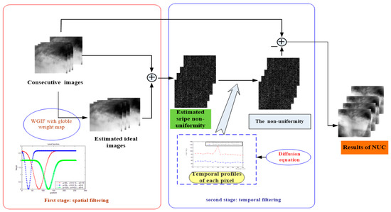 More closely related to our work are the approaches that combine spatial filter and temporal filter, such as those presented in References [11,12,13]. In these papers, the raw image was first separated into low-frequency components and high-frequency components by low pass filter or edge-preserving filter in the spatial domain and then the high-frequency components were processed by high-pass filter in temporal to correct nonuniformity. The key point is the image separation into two parts. If there are too many image edge detail residuals in the high-frequency components that decomposition from raw images by filtering, the image degradation will be more serious in corrected images. In contrast, we address the task of stripe nonuniformity correction by applying WGIF with our adaptive weight to separate the raw image in the spatial domain, which has a better performance of non-uniformity and scene separation effect, and in the temporal domain a non-linear diffusion equation is proposed to deal with the nonuniformity sequence so that the nonuniformity correction needs only a few frame images.