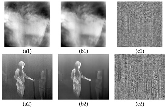 Figure 6 shows the simulated results of the Formula 13. The observed images are in Figure 6a1,a2, namely X (b1,b2) represent the ideal image B (c1,c2) are the stripe nonuniformity images. According to Figure 6c1,c2, the scene residuals still exist in the stripe nonuniformity images. Hence, the corrected image will suffer from quality degradation and the loss of important information, such as small targets and details. To address this problem, we propose a nonlinear diffusion equation to process the pixel temporal profile for estimating the more accurate value of the nonuniformity to remove the scene residuals from the nonuniformity images.