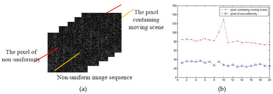 In the second step, we attempt to remove the scene residuals from the nonuniformity images taking advantage of the different characteristics of nonuniformity and scene residuals in temporal domain, so as to estimate more accurate nonuniformity values. temporal profile is a curve describing the change of a pixel in a continuous frame image. Figure 7a,b shows the formation of the temporal profile and two temporal profiles in the nonuniformity image sequence, respectively. According to Figure 7b, the pixel values of the nonuniformity change slowly in sequent images (see the blue curve), while the values of the moving scene residuals exhibit drastic fluctuations (see the red curve). In order to eliminate the mutation points in stationary curves, i.e., scene residuals in nonuniformity images, we construct a nonlinear diffusion equation to process the temporal profiles for obtaining more accurate nonuniformity values.