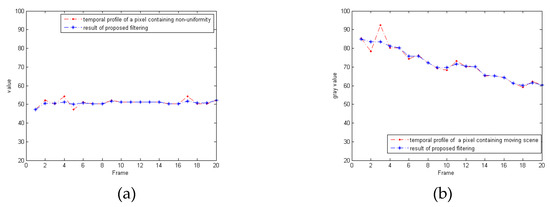 Results of nonlinear diffusion equation filtering. (a) A pixel containing the nonuniformity and (b) a pixel containing the moving scene.