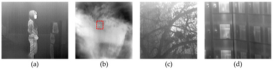 Four raw IR image sequences for testing. (a) A walking girl, (b) a moving small target against a sky background, (c) a plant, and (d) windows.