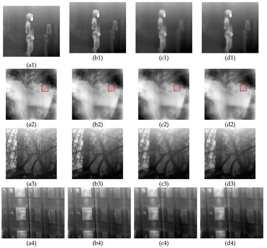 NUC results that were obtained using various weights. (a1–a4) The original image, (b1–b4) the proposed weight, (c1–c4) the weight of [26], and (d1–d4) the Sobel weight.
