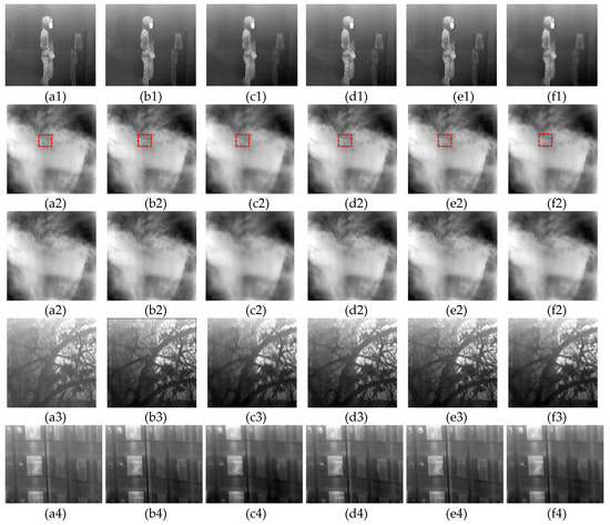 NUC results of five methods. (a1–a4) The original image, (b1–b4) the TVRNN NN result, (c1–c4) the BF-THPF result, (d1–d4) the MIRE result, (e1–e4) the CNN result, and (f1–f4) the result of the proposed method.