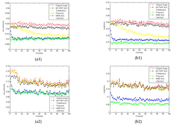 Curves of roughness and nonuniformity for Sequence 1 and Sequence 2. (a1,a2) Nonuniformity and (b1,b2) roughness.