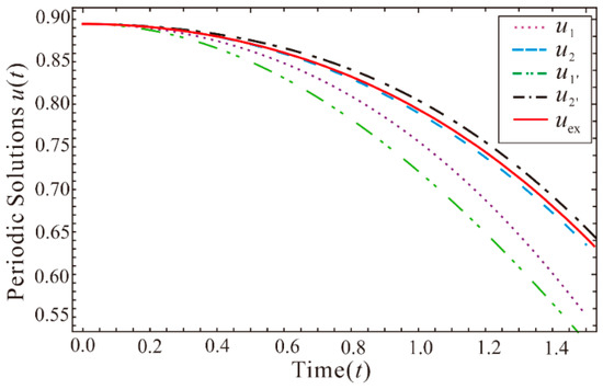 For (i.e., ), the exact periodic solution solved by numerical integration of Equation (14), the analytical approximate solutions of different orders calculated by the present method and the approximate solutions of the first two orders obtained by HBM, respectively, as well as their absolute errors, are presented in Figure 1 and Figure 2. These figures show that, the present method provides excellent approximations as compared to the results by the harmonic balance method.