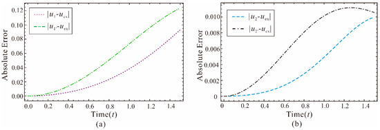 Absolute errors of analytical approximations for different orders (a) the first order approximate solution and (b) the second order approximate solution.
