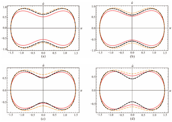 Four different sets of parameters for Equation (45) are listed in Table 3. The new collection point is calculated for the purpose of comparison. In Figure 4, we compare the phase diagrams of G1 to G4 between the first order dynamic frequency and the modified EBM which transfers the analysis from an isolated linear collocation point to globally effect of nonlinearity.