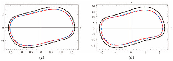 Comparison of approximate solutions of Equation (45) under different sets of parameters: (a) G1; (b) G2; (c) G3; (d) G4; Runge-Kutta method (red solid line), the first order dynamic frequency method (black dotted line), modified energy balance method with a1 (blue dashed line).