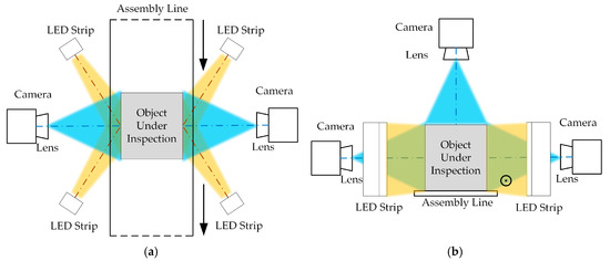 Diagram of dynamic visual inspection system: (a) top and (b) front view.