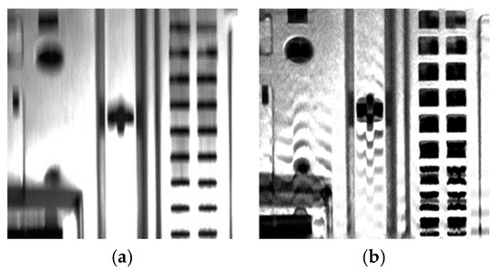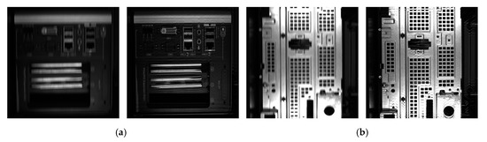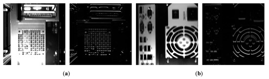 Examples of preprocessing for dynamic visual inspection. The examples in (a) and (b) show the blurred image (left) and the result of preprocessing (right).