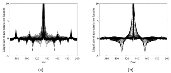 where FFT and FFT−1 denote the Fourier transform and its inverse, respectively, and is the autocorrelation function with the same size as the blurred image. To visualize function , we plotted its columns according to the row in a plane, where the x-axis scale ranged from 1 to the number of rows in . This visualization results in conjugate pairs of valleys that retrieve sinc-shaped curves in the autocorrelation function, where the lowest pair corresponds to the blur length.